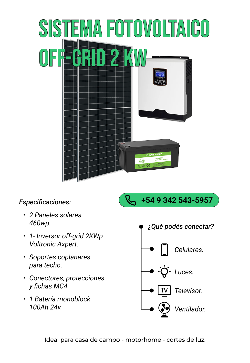 Kit solar off-grid de 2kW ideal para viviendas o respaldo energético. Incluye 2 paneles de 460W, inversor Voltronic Axpert, batería 24V 100Ah, estructura y protecciones. Energía limpia, confiable y lista para instalar.